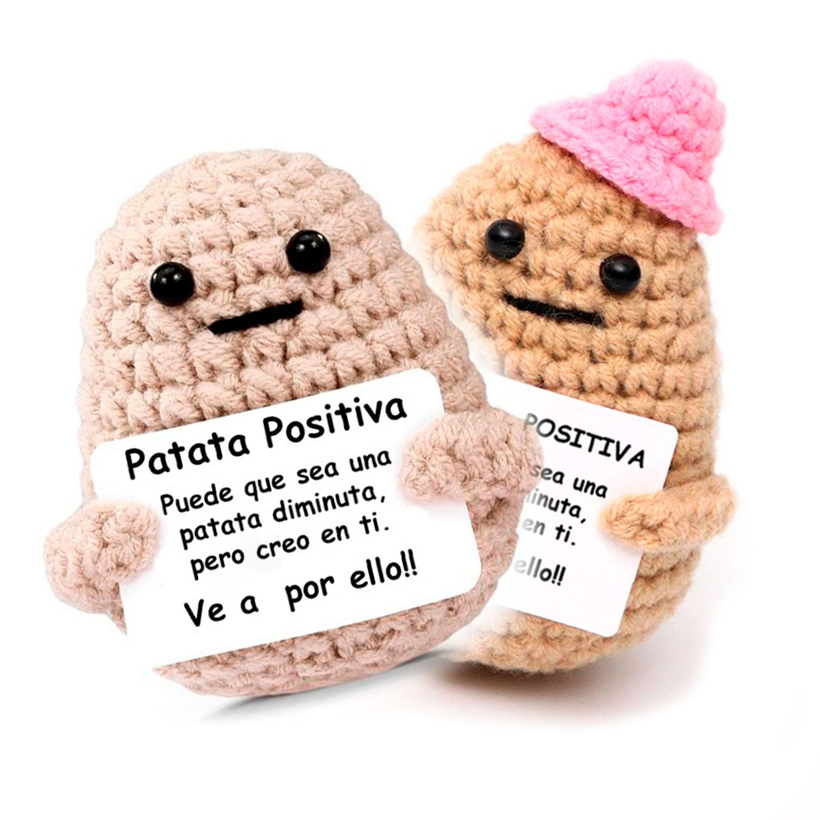 Mr. Patata Positiva y Miss. Patata Positiva son unos muñequitos pequeños con una gran misión: sacarte una sonrisa y darte un empujón de ánimo cuando lo necesites. Estos simpáticos personajes sostienen una pancarta con mensajes motivadores que te harán sentir bien en cualquier momento del día.